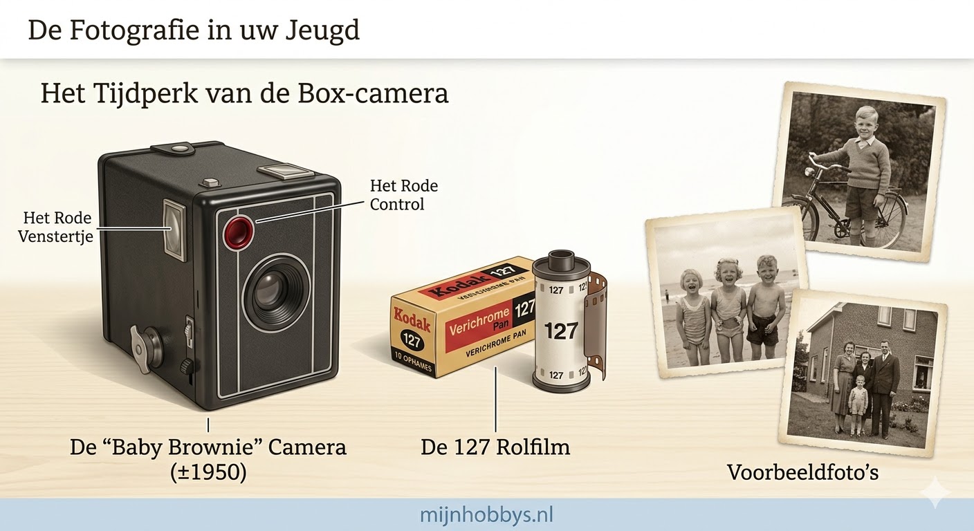 De Jaren ’50 (Het Box-tijdperk): Zoals u zich herinnert, de tijd van de eenvoudige bakelieten boxcamera’s (zoals de Brownie). Fotografie was nog echt voor bijzondere momenten.